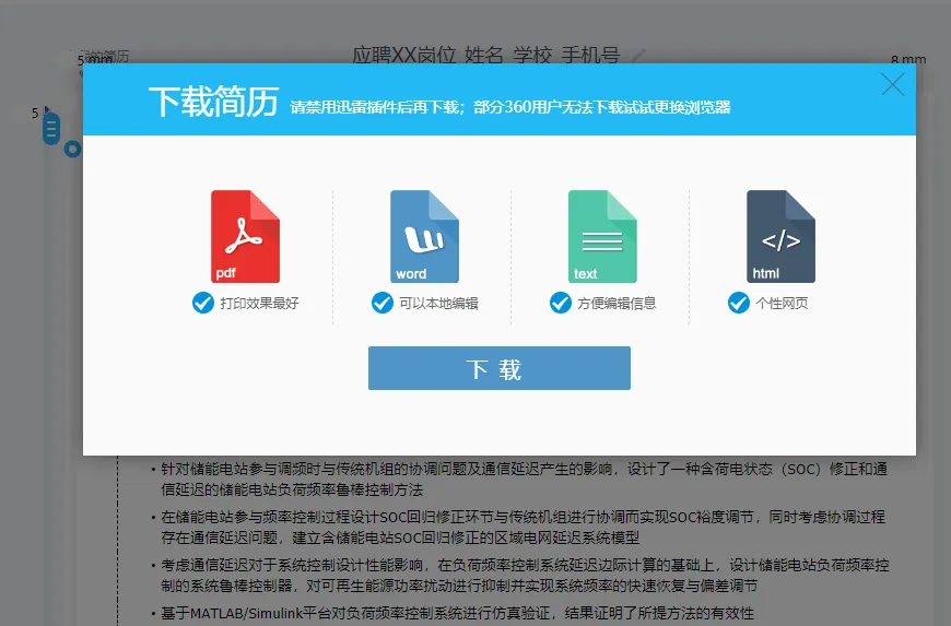 5.编辑完成后单击“下载”按钮即可按需下载不同格式简历