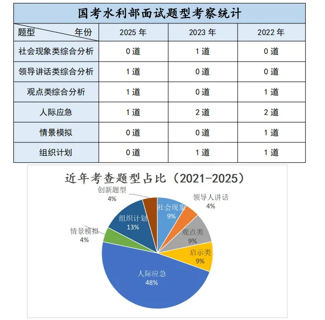(一)总体趋势:从五年的数据来看,国考水利部面试题型较为丰富多样,涵盖了综合分析、人际应急、情景模拟、组织计划和创新题型等多个方面,这体现了对考生综合素质和能力的全面考查。