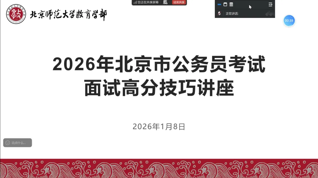 2026年1月8日,由教育学部研究生会就业创业部主办的2026年北京市公务员考试面试高分技巧讲座顺利举行。本次讲座特邀成公教育米原老师担任主讲,旨在为即将参加公务员面试的考生提供系统、实用、有针对性的备考指导。