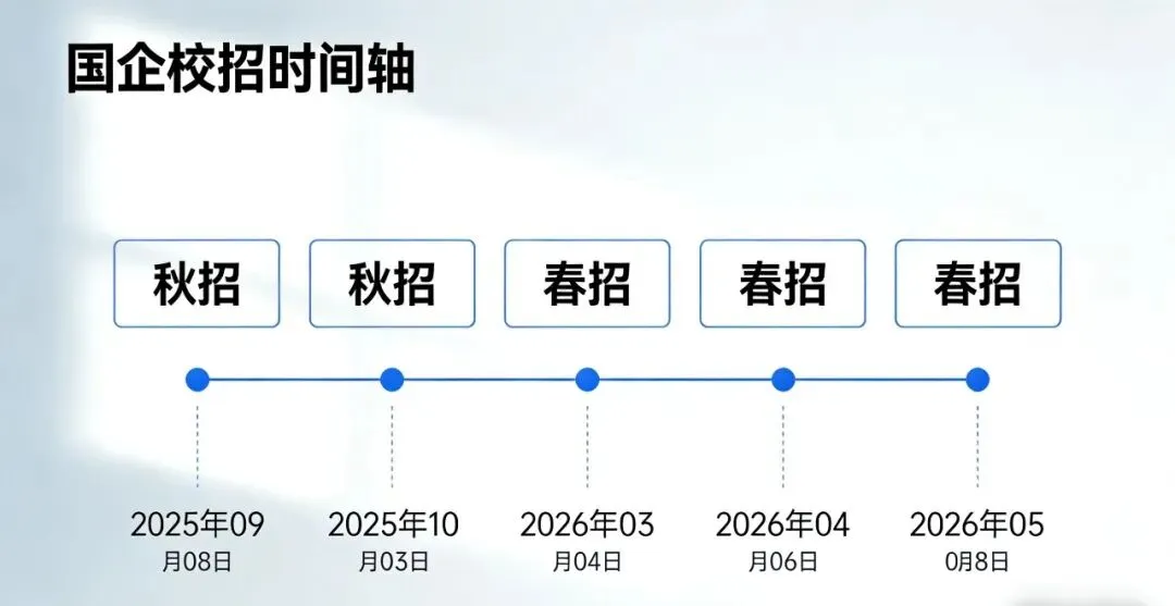 为了方便你提前规划,这里是2025-2026年国企校招的关键时间节点:这是全年规模最大的招聘季。国家电网、中国建筑、各大银行等都会在9月集中开启网申。部分企业会在第一批招聘结束后,发布少量补录岗位。这是错过秋招的同学的最后机会。春招主要针对考研失利、秋招不理想的同学。招聘规模相对较小,但竞争也更激烈。网申一般在2月底3月初开启,笔试和面试会在3月到4月密集进行。一些企业会在毕业季前释放最后一批岗位,主要为了填补用人缺口。