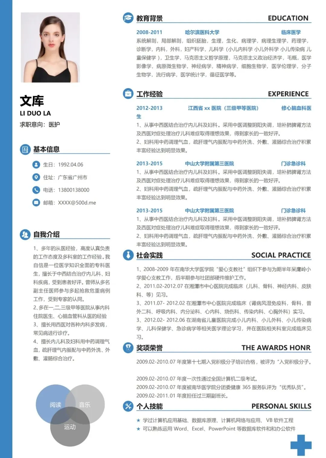 本文分享的是医护求职简历模板
