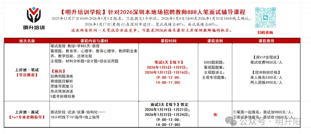 点击链接或扫描二维码,了解大唐明升培训学院“面试冲刺护航计划”的详细课程安排与师资介绍。深圳编制 | 大唐明升教育赋能天团,承包你的考编、教学与亲子成长全需求