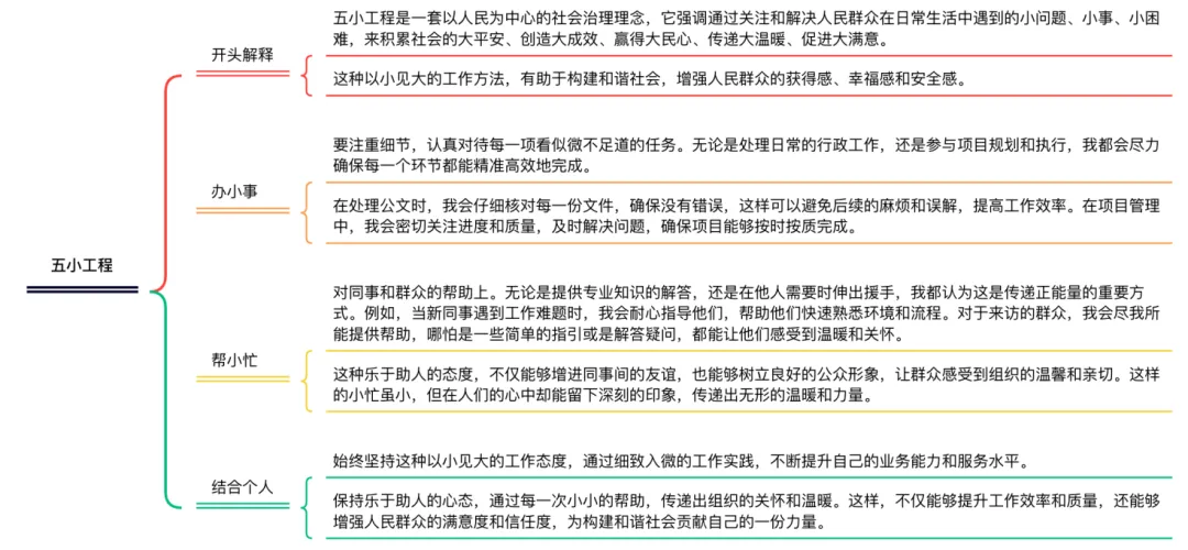 五小工程:立足破小案,积累“大平安”;立足办小事,创造“大成效”;立足解小忧,赢得“大民心”;立足帮小忙,传递“大温暖”;立足惠小利促进“大满意”。任选两个,结合岗位实际谈谈你的看法。五小工程是一套以人民为中心的社会治理理念,它强调通过关注和解决人民群众在日常生活中遇到的小问题、小事、小困难,来积累社会的大平安、创造大成效、赢得大民心、传递大温暖、促进大满意。这种以小见大的工作方法,有助于构建和谐社会,增强人民群众的获得感、幸福感和安全感。下面我将结合岗位实际,谈谈我对“立足办小事,创造‘大成效’”和“立足帮小忙,传递‘大温暖’”这两个方面的看法。首先谈谈“立足办小事,创造‘大成效’”。这意味着要注重细节,认真对待每一项看似微不足道的任务。无论是处理日常的行政工作,还是参与项目规划和执行,我都会尽力确保每一个环节都能精准高效地完成。通过这种方式,即使是最小的努力也能积累起来,形成可观的整体成效。例如,在处理公文时,我会仔细核对每一份文件,确保没有错误,这样可以避免后续的麻烦和误解,提高工作效率。在项目管理中,我会密切关注进度和质量,及时解决问题,确保项目能够按时按质完成。这些小事的累积,不仅提升了工作质量,也增强了团队的凝聚力和执行力,最终为组织带来了显著的成效。其次探讨“立足帮小忙,传递‘大温暖’”。在工作中,这通常体现在对同事和群众的帮助上。无论是提供专业知识的解答,还是在他人需要时伸出援手,我都认为这是传递正能量的重要方式。例如,当新同事遇到工作难题时,我会耐心指导他们,帮助他们快速熟悉环境和流程。对于来访的群众,我会尽我所能提供帮助,哪怕是一些简单的指引或是解答疑问,都能让他们感受到温暖和关怀。这种乐于助人的态度,不仅能够增进同事间的友谊,也能够树立良好的公众形象,让群众感受到组织的温馨和亲切。这样的小忙虽小,但在人们的心中却能留下深刻的印象,传递出无形的温暖和力量。最后,五小工程中的“立足办小事,创造‘大成效’”和“立足帮小忙,传递‘大温暖’”是相辅相成的两个方面。在我的岗位上,我会始终坚持这种以小见大的工作态度,通过细致入微的工作实践,不断提升自己的业务能力和服务水平。同时,我也会保持乐于助人的心态,通过每一次小小的帮助,传递出组织的关怀和温暖。这样,不仅能够提升工作效率和质量,还能够增强人民群众的满意度和信任度,为构建和谐社会贡献自己的一份力量。总之,五小工程是一种贴近民生、服务人民的治理理念,它要求我们在日常工作中注重细节,关心小事,通过实际行动积累大成效,传递大温暖。作为一名公务员,我将继续秉承这一理念,立足本职,服务人民,为社会的和谐与进步贡献自己的力量。五小工程不仅是一套工作方法,更是一种服务理念。它要求我们在平凡的工作岗位上,用心做好每一件小事,用情帮助每一位需要帮助的人。只有这样,我们才能在小事中积累大智慧,在小忙中传递大爱心,在小利中促进大和谐,从而为实现社会的长治久安和人民的幸福生活做出积极的贡献。