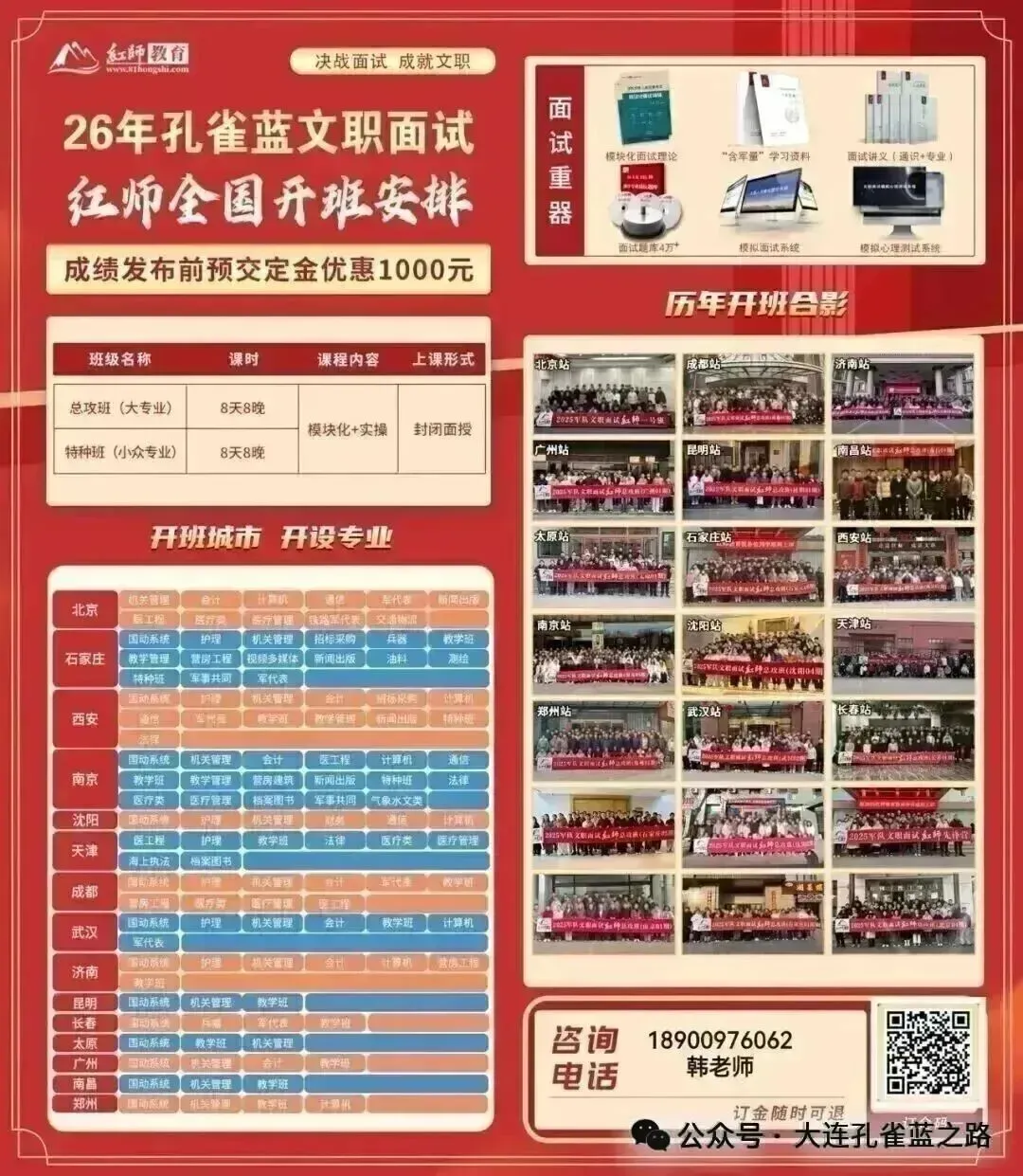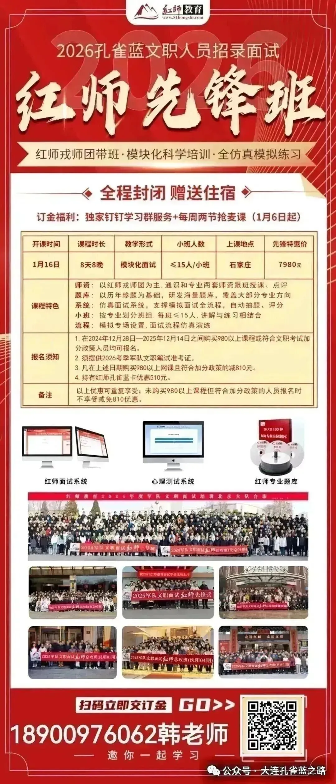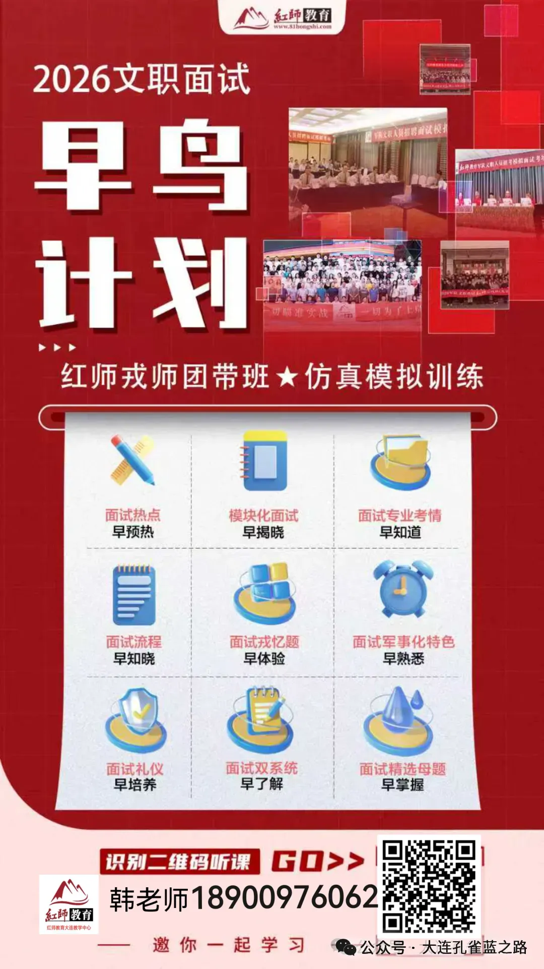 红师教育专注于文职培训8年,承训了大量笔试和面试的学员。备考遇到任何问题可以联系红师教育大连教学中心韩老师。每年所带学员都有上岸,为您1对1免费解答!