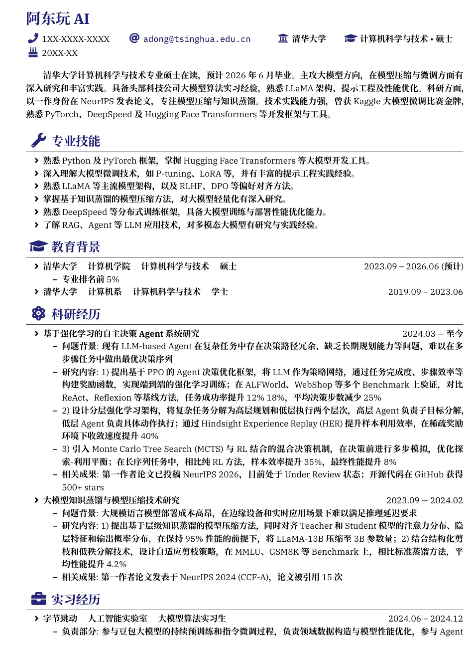 一个专为大模型算法工程师打造的 LaTeX 简历模板,适合求职大模型、Agent、RAG、NLP 等 AI 相关岗位。
