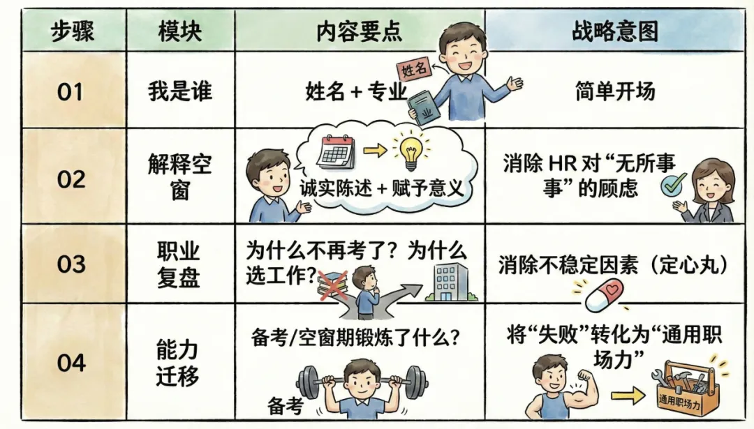 “面试官好,我是[姓名]。您可能注意到我毕业后有[X个月]的空窗期。
