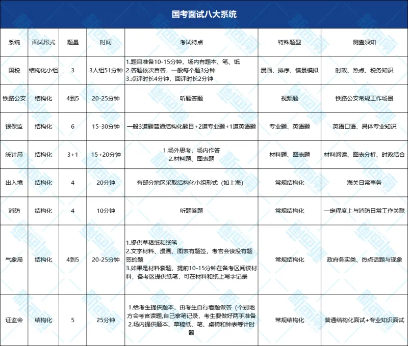 国考常见4种面试形式:结构化、结构化小组、无领导小组、材料结构化。往年国考不同系统面试考情都不太相同,这里汇总八大系统常见面试详情:
