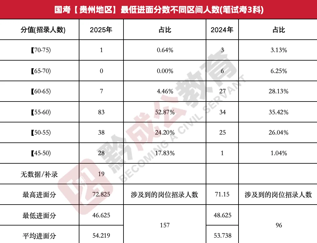 2025年贵州地区国考岗位平均进面分为:54.219分