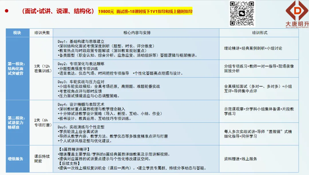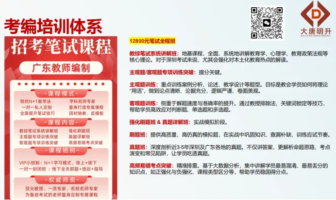 点击链接或扫描二维码,了解大唐明升培训学院“面试冲刺护航计划”的详细课程安排与师资介绍。深圳编制 | 大唐明升教育赋能天团,承包你的考编、教学与亲子成长全需求