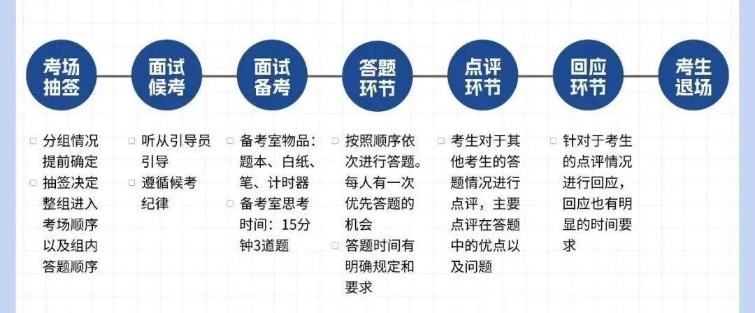 答题时间:每道题答题时间不超过3分钟,总时长根据题目数量而定,一般为20-25分钟。每人每次点评和回应不超过2分钟。