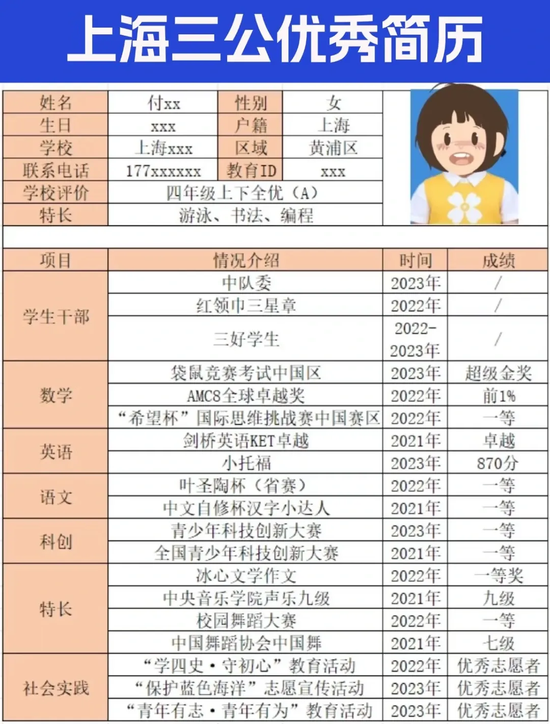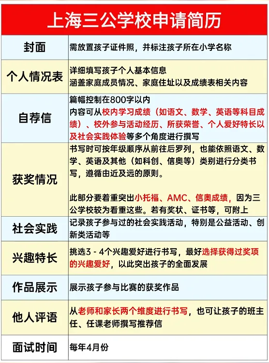 一份优质的简历如同闪亮的敲门砖,能让面试官在众多简历中一眼注意到孩子。三公申请是在五年级上学期提交申请材料,一般在4月份,家长们需在此之前精心准备好简历。