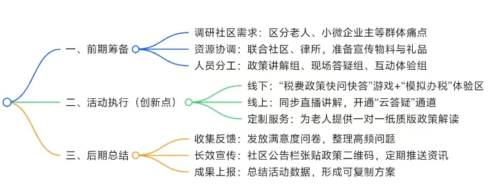 这是本次活动的核心亮点,我会采用“线上+线下”“理论+互动”的模式。线下设置三个区域:一是政策讲解区,针对不同人群开展分众化宣讲,比如给老年人讲解养老金个税优惠政策,给商户讲解发票管理知识;二是模拟办税区,让居民亲身体验电子税务局的操作流程,解决“不会用”的问题;三是互动游戏区,通过“税费知识快问快答”“大转盘抽奖”等形式,激发居民参与热情,答对的居民可以获得定制的普法小礼品。线上同步开启直播,邀请税务专家在线答疑,对于无法到场的居民,还可以通过直播回放查看内容,同时我们会在社区微信群推送政策二维码,方便居民随时查阅。