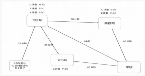 学校即将举办一场重要的活动,邀请了七位评委前来参与评审。考虑到评委们旅途劳累,学校给你分配了两辆车负责接送评委,并且每辆车配备一名熟悉路线的引导人员,负责与评委沟通和解答疑问。请你根据下图信息,合理规划路线,制定详细的接送方案,在下午2点半之前把评委老师全部送到学校。