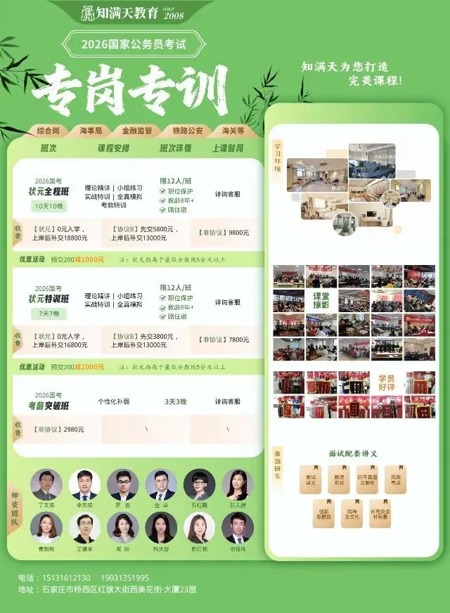 3.面试时间:时间包干制,一共20分钟(往年有25分钟5道题的情况),一般提前5分钟提醒。当采用材料题时,考生在场外6分钟看材料,场内16分钟答题,场外做的笔记通常可以带入场内。