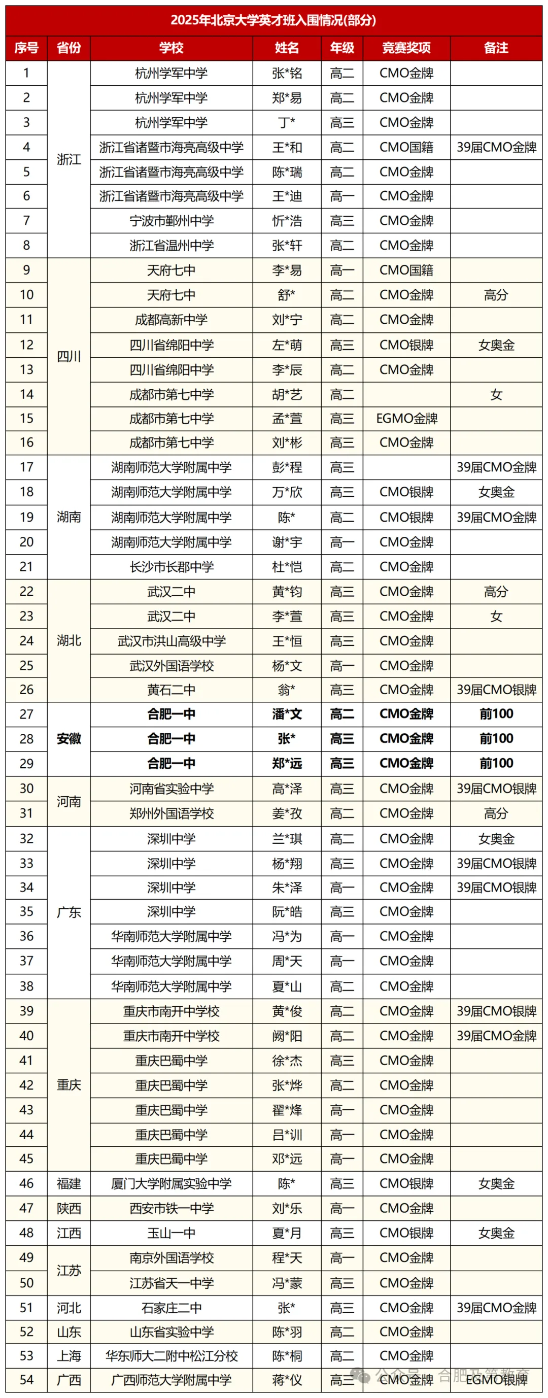 从网络收集到的2025年北京大学数学英才班部分名单,其中浙江省入取人数高达8人,四川、广东、重庆有7人入取表现不俗,安徽有3人,均来自合肥一中。相对清华,北大数学英才班对奖项的要求更高,主要以金牌为主,少数银牌有机会入围,已获得竞赛国集保送资格的考生将按保送程序录取。以下为详细名单情况,名单根据家长消息、学校喜报以及官方公示整理,如有错漏烦请指正: