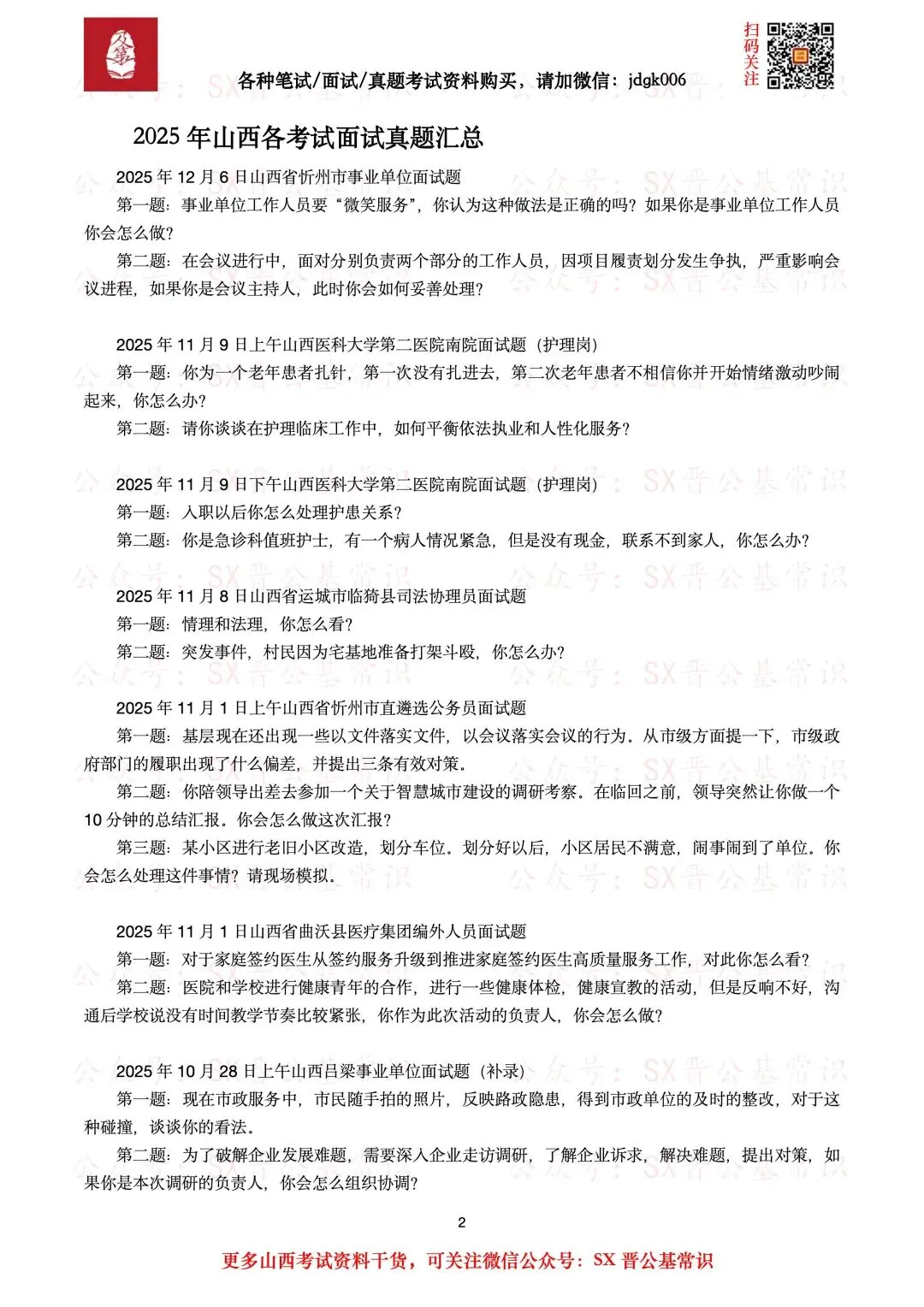 山西各地各考试面试真题汇总内含:2021年—2025年山西各地各考试面试真题汇总,包含山西公务员、山西事业单位、山西教师招聘、山西招警、山西三支一扶等各种考试的面试真题。总计110页。试题来源于网友回忆及网络整理,仅供学习参考。