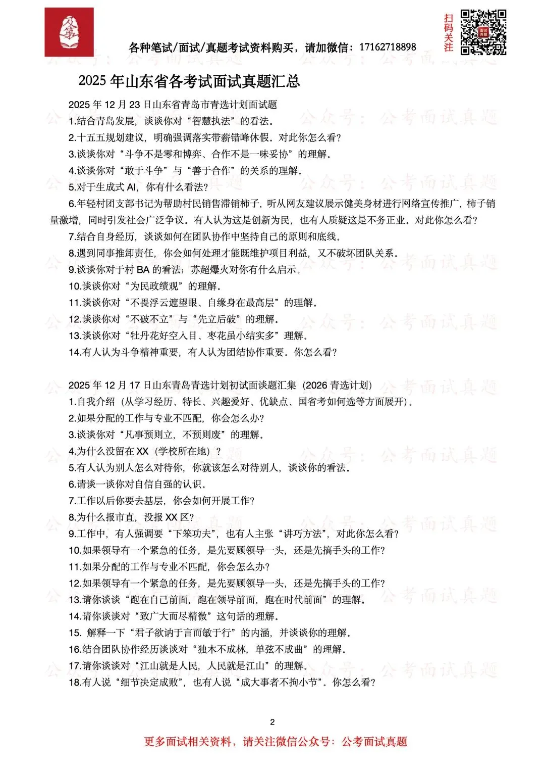 山东各地各考试面试真题汇总内含:2021年—2025年山东各地各考试面试真题汇总,包含山东公务员面试、山东事业单位面试、山东教师考试面试、山东招警考试面试、山东三支一扶面试等各种考试的面试真题汇总。总计204页。试题来源于考生回忆及网络整理,仅供学习参考。