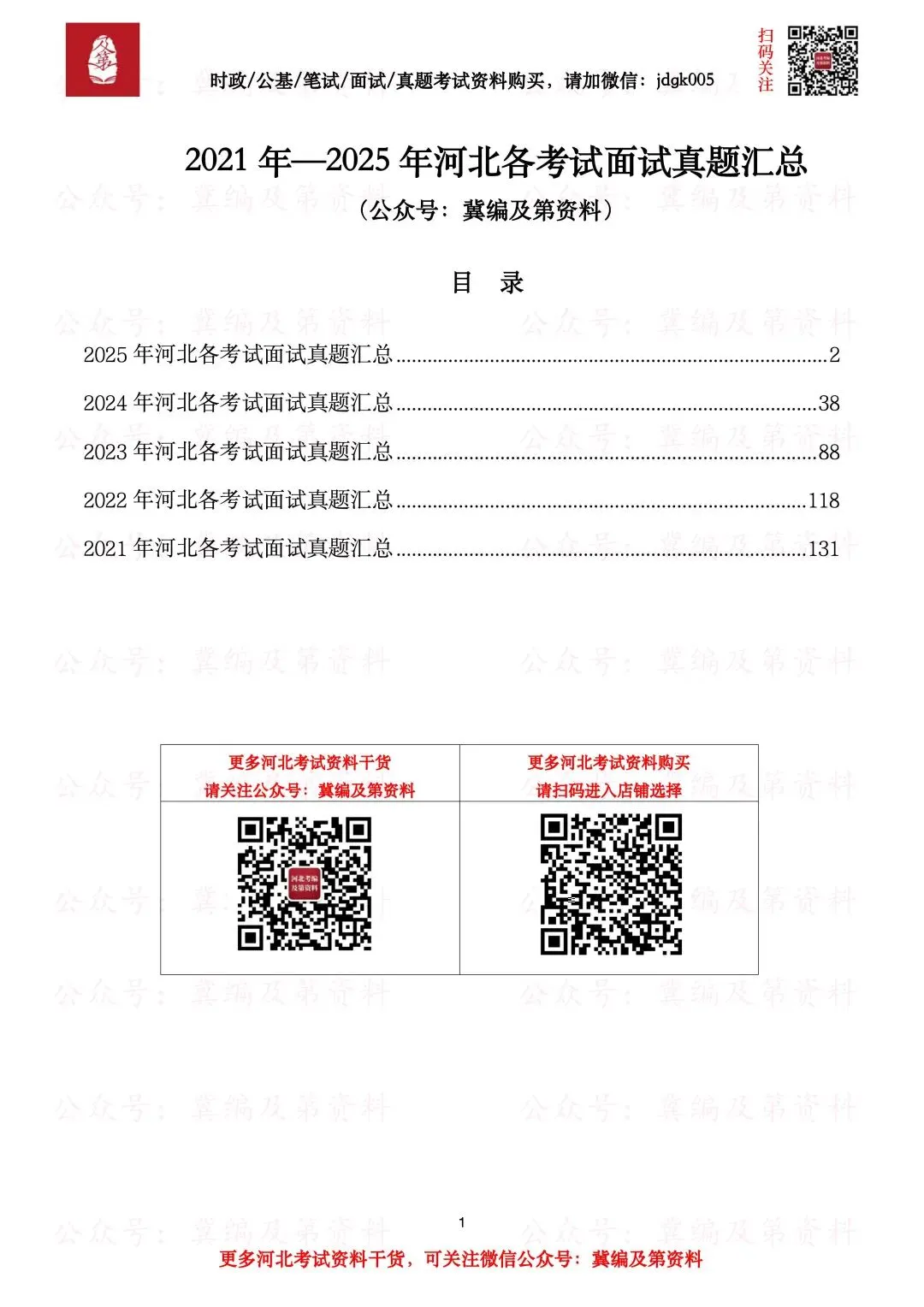 河北各地各考试面试真题汇总内含:2021年—2025年河北各地各考试面试真题汇总,包含河北公务员、河北事业单位、河北教师招聘、河北招警、河北三支一扶等各种考试的面试真题。总计144页。试题来源于网友回忆及网络整理,仅供参考。
