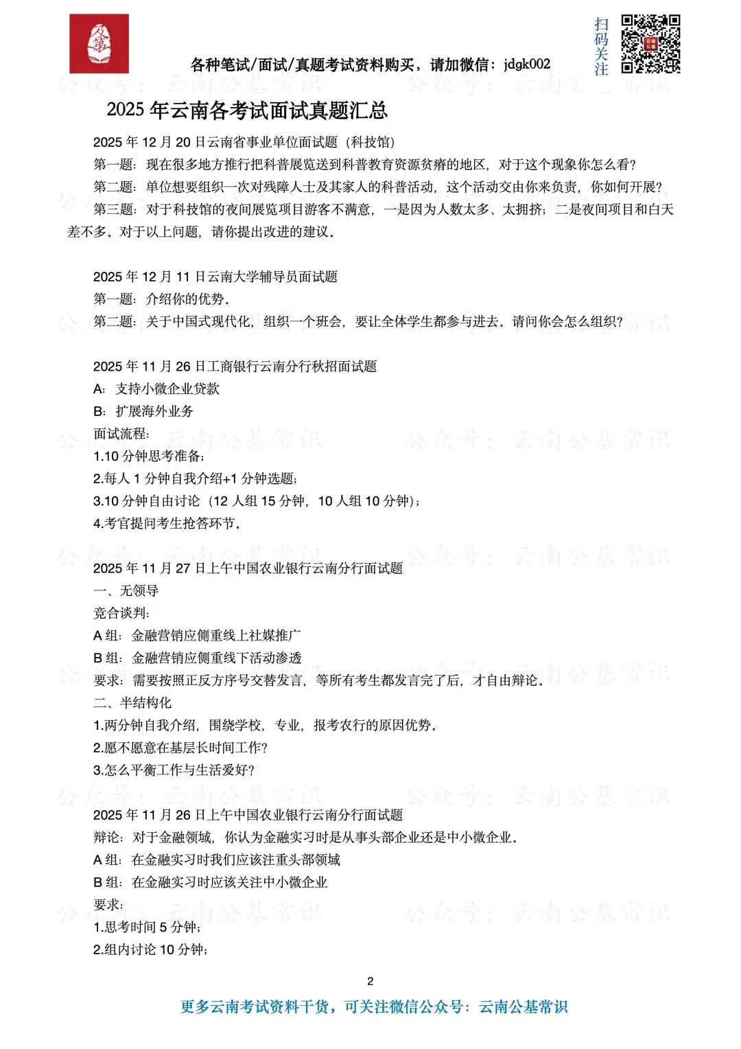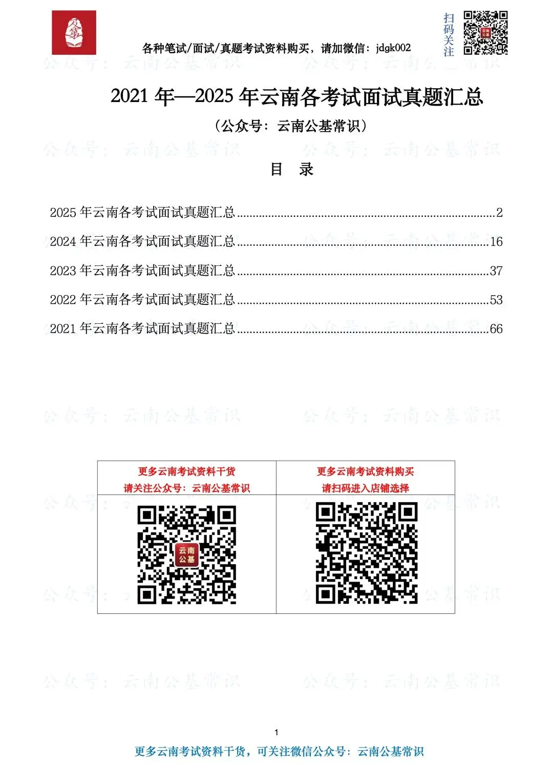 云南各考试面试真题汇总内含:2021年—2025年云南各考试面试真题汇总,包含云南公务员、云南事业单位、云南教师、云南招警、云南三支一扶等各种考试的面试真题。总计70页。