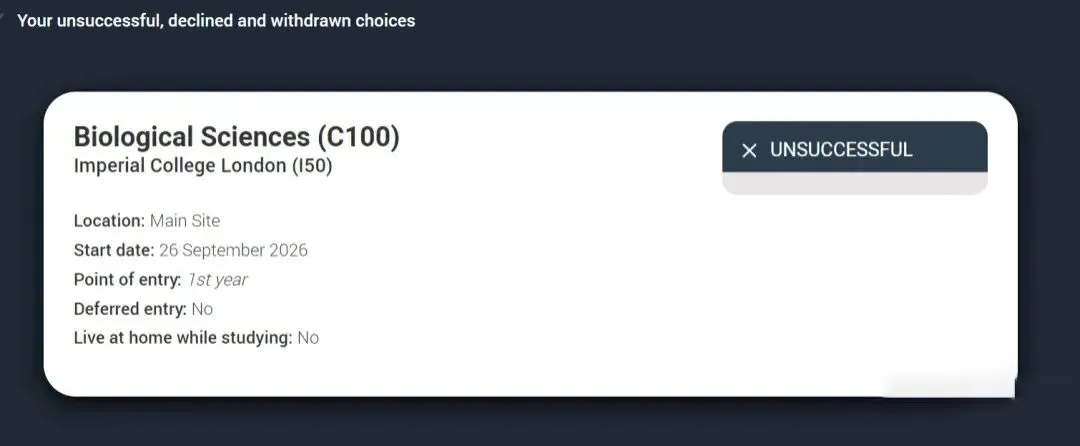2026FALL英本申请季迎来了“最快拒信”记录:有学生在9月23日提交UCAS申请,申请了IC med bio和biosci两个专业,仅六天后(29日)就收到帝国理工学院IC的“unsuccessful”状态更新。
