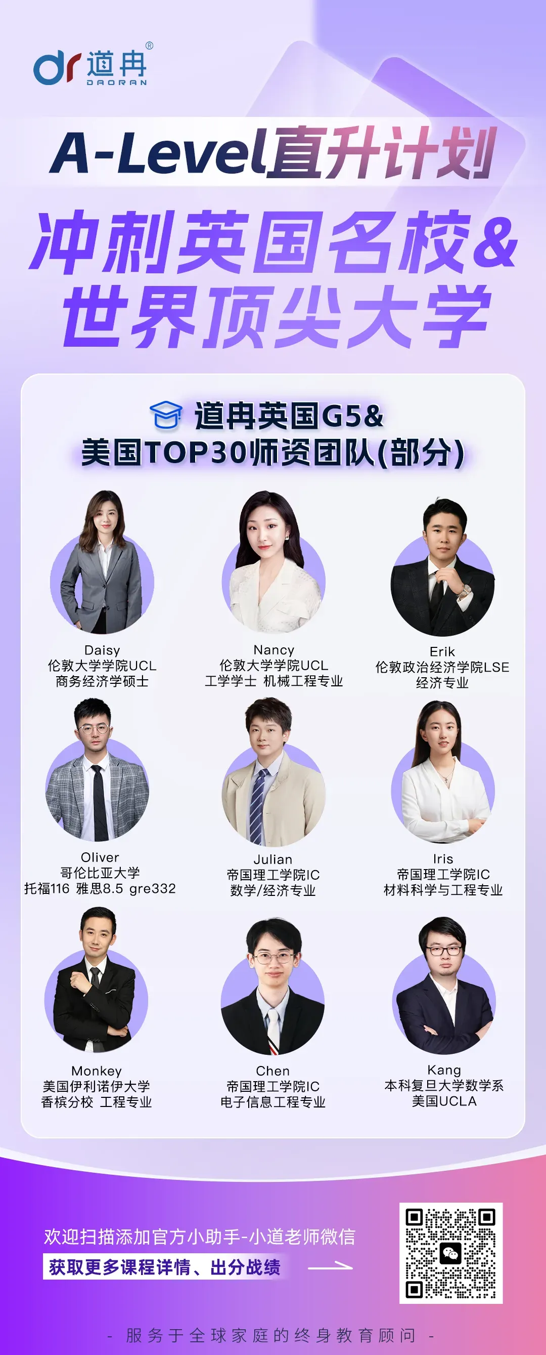 道冉【A-Level直升计划】由英国G5&美国TOP30名校资深师资团队全力护航,助你迅速精准提升分数,A-Level全科覆盖无遗漏!