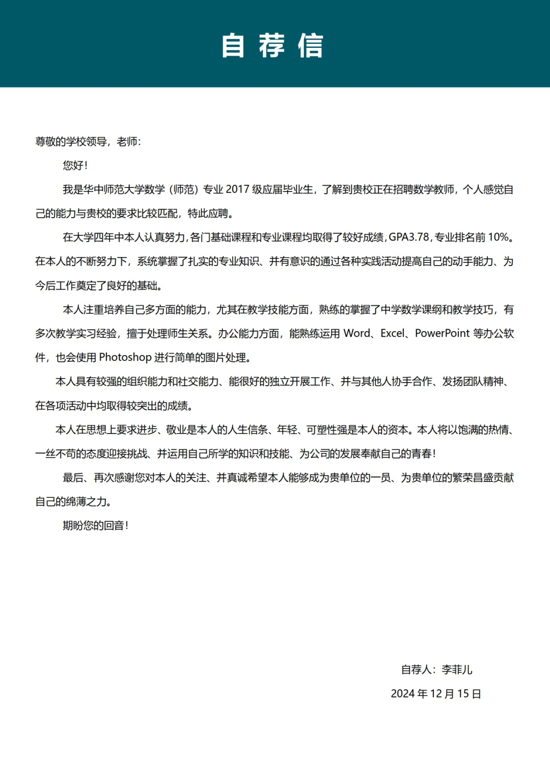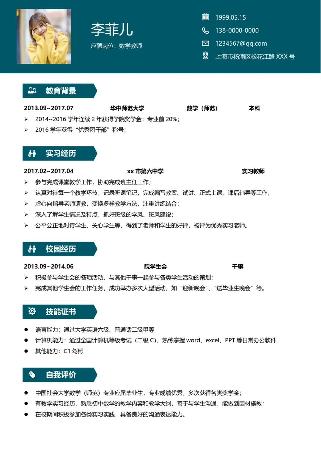 数学教师个人简历模板,WORD文档电子版,可免费下载打印
