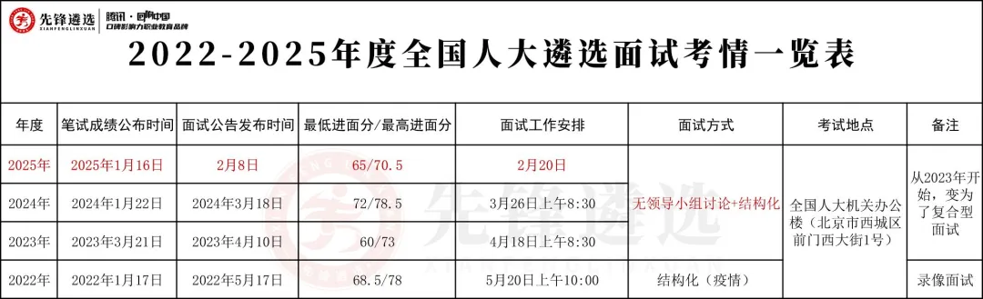 全部结束后,引导员把考生带到另外一个答题室,进行结构化答题。桌子上有题本,只有 1 道题目,在正式作答之前,考官会让你做一个自我介绍,以及谈谈你的岗位优势与劣势,加起来作答不要超过 10 分钟。结束后,考生就可以回家了,因为全国人大是面试前一天进行体检,无须再等体检通知了。详情见下表: