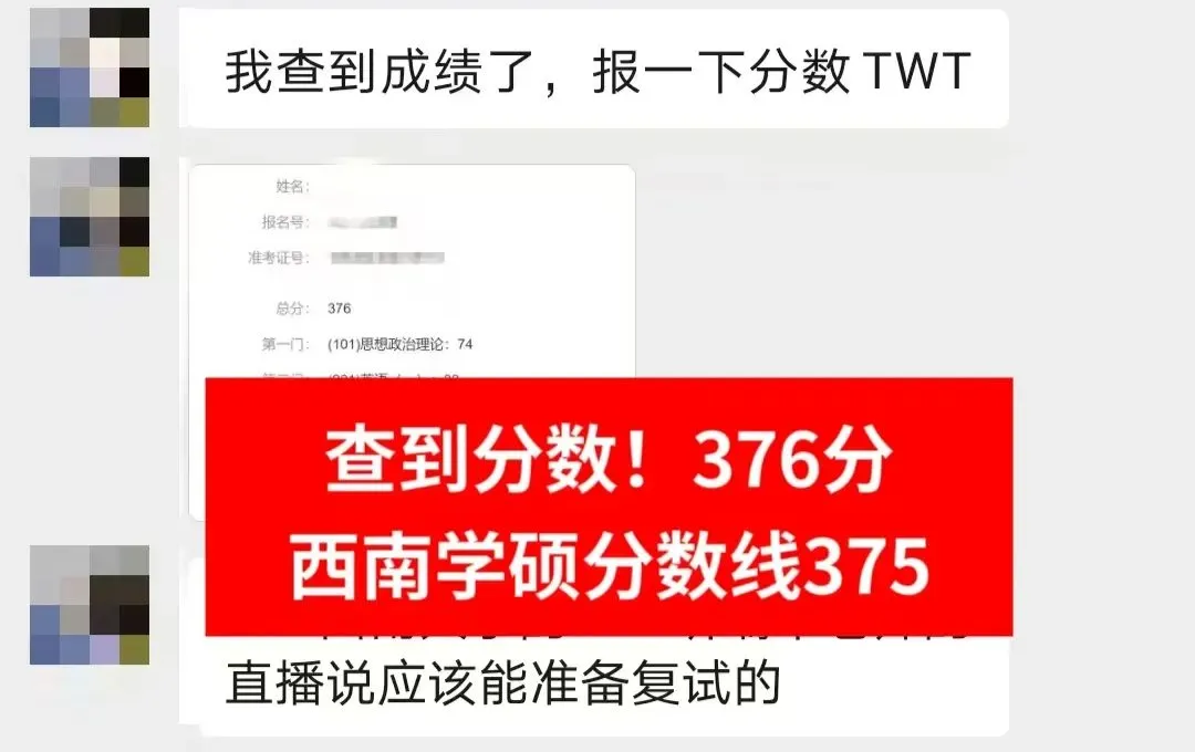 )✅前年还有一位考西南学硕的同学,复试线375,她初试成绩376,压线进复试,报名复试班后,成功上岸