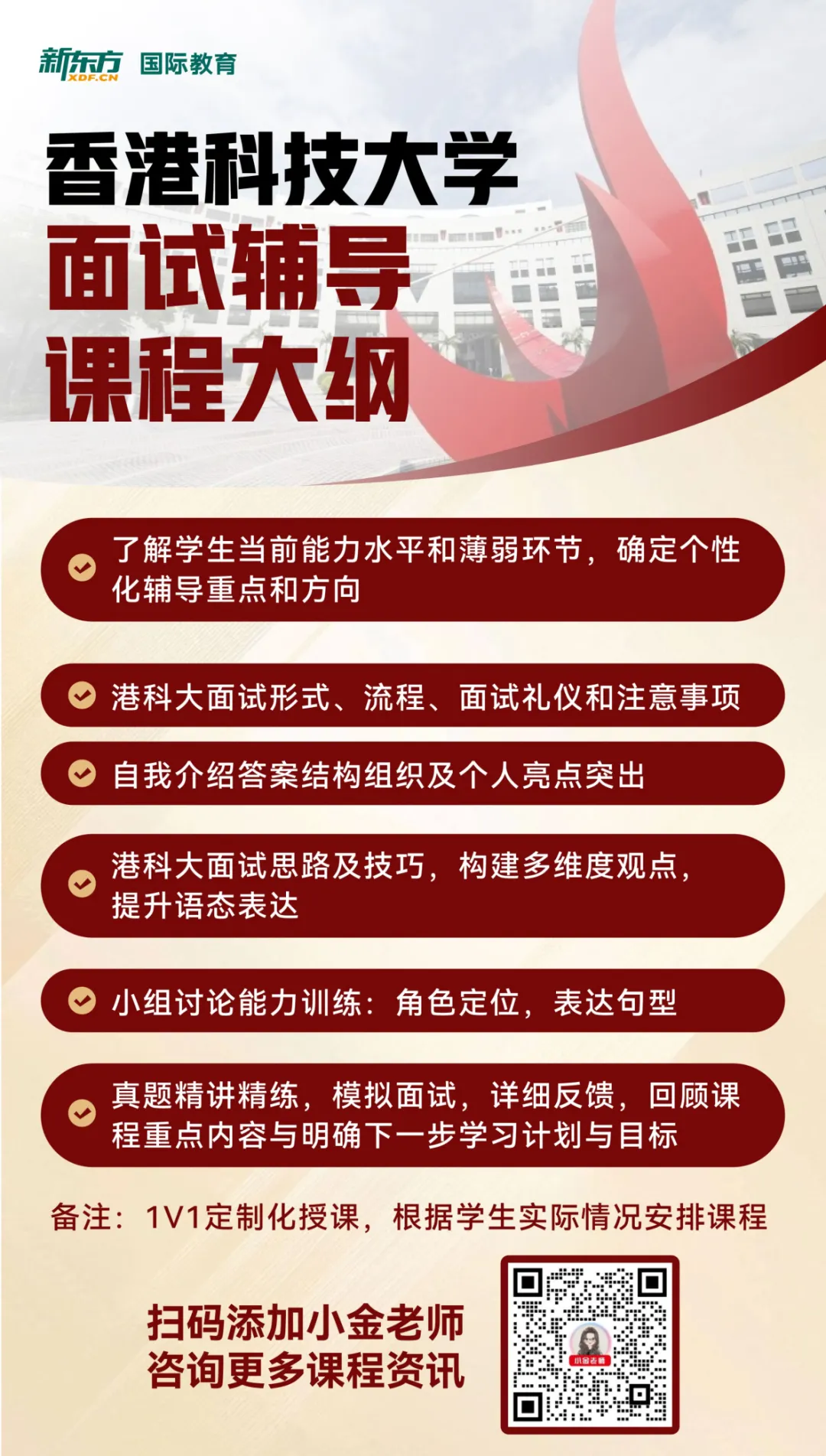 香港科技大学非常注重申请人的综合素质,包括心理素质、逻辑思维、应对与沟通能力等。面试内容没有特定范围,时事、生活到个人兴趣都有机会成为面试题目。面试时,申请人阐述理念观点立场要言之有物,条理清晰并有逻辑性。在小组讨论的互动中,展现自己,尊重他人。