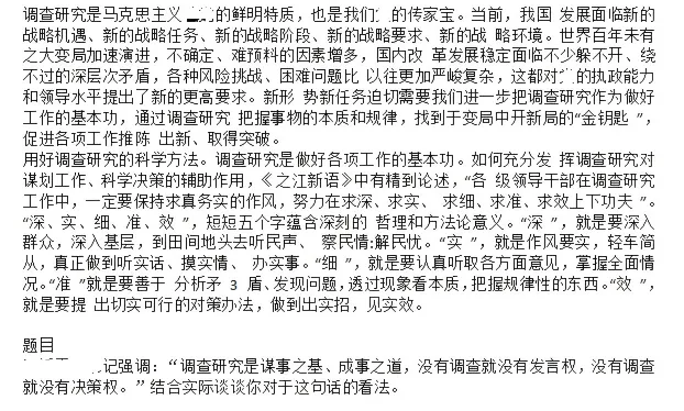 题目: 大领导强调:“调查研究是谋事之基、成事之道,没有调查就没有发言权,没有调查就没有决策权。”结合实际谈谈你对于这句话的看法。