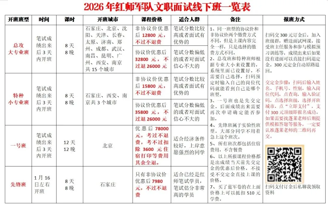 总攻班:是今年的主要班型,除了兽医、小语种等小众化专业岗位之外,其他专业的岗位都是总攻班,培训时间8天8晚,笔试出成绩后第2天开班,送住宿(餐费自理),小班教学,每个专业班不超15人,由对口退役师资带班。交费可以选择协议价和非协议价(两种上课是一样的),其中协议价35800元(现在交定金优惠到32800元),不过退26000元(以军队人才网最终公示录取名单为依据,不管什么原因未录取都退);非协议价15800元(现在交定金优惠到12800),不过不退费。
