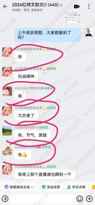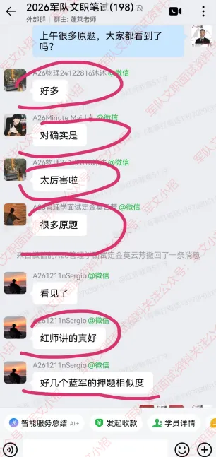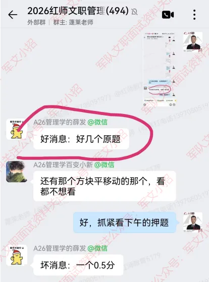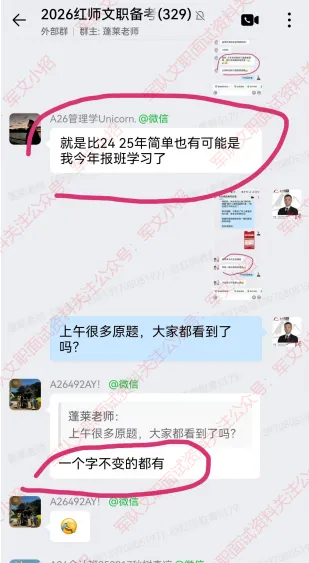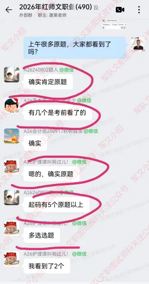 很多红师学员在交流群惊叹的说到:“好多原题”、“红师真真牛”、“红师年年猜中”......!红师教育只想一心服务好学员!一起来看看2026年军队文职考试中红师的战绩吧!学员评价和压中题目对照!