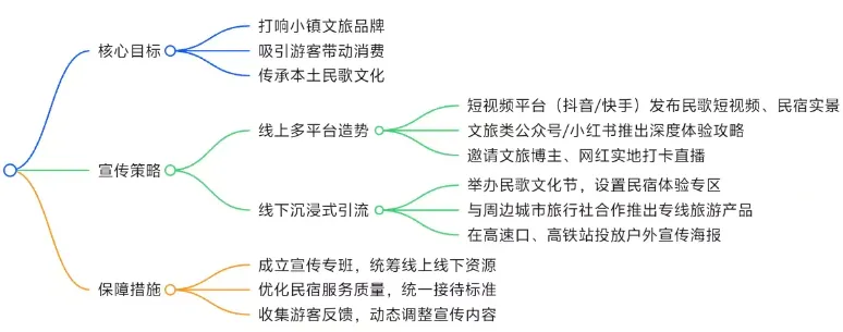 传实施线上线下联动的宣传策略。线上聚焦流量引流,在抖音、快手等短视频平台发布民歌传承人演唱片段、民宿庭院实景、游客体验vlog,搭配热门话题增加曝光;联合文旅博主实地打卡,推出“听民歌、住民宿”深度攻略;同时开通小镇文旅公众号,定期更新活动资讯和优惠套餐。线下侧重沉浸式体验,举办首届小镇民歌文化节,设置民歌擂台赛、民宿体验展等环节,邀请周边市民参与;与周边城市旅行社合作,推出“民歌民宿两日游”专线产品;在高铁站、高速服务区投放宣传海报,精准触达出行人群。