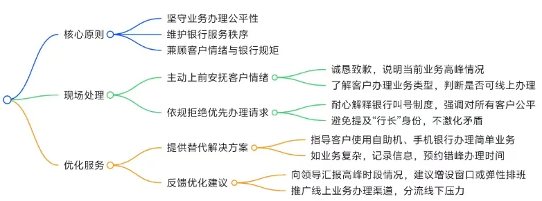 总结反馈,长效优化。处理完后,及时向领导汇报高峰时段的业务办理情况,建议增设弹性窗口、推广线上办理渠道,从根本上缓解排队久的问题,提升客户的服务体验。