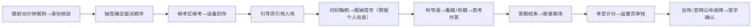 1.核心流程:考生提前30分钟报到,核对身份后抽签确定面试顺序,通信设备统一收取保管;进入候考区候考,禁止随意离开与喧哗;由引导员引导入场,按规定流程答题,答题结束后离场候分,成绩合格线为60分,不合格者不得进入后续环节。