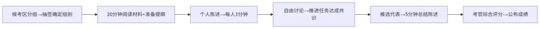 2.核心流程:提纲准备(20分钟阅读材料+撰写提纲)→个人陈述(每人3分钟,按抽签顺序发言)→自由讨论(时长按人数核算,一般为每人7分钟)→推选代表总结陈述(5分钟),全程考官观察打分,不参与提问互动。