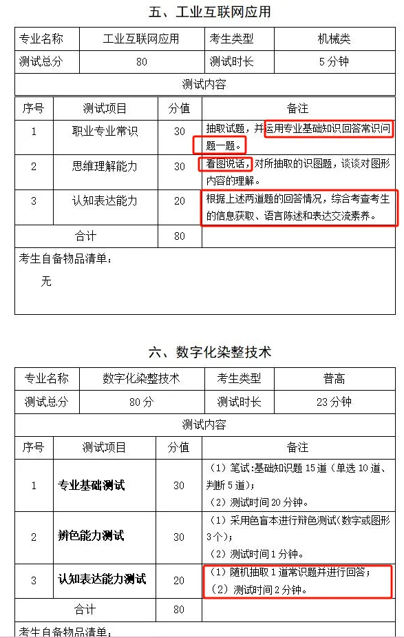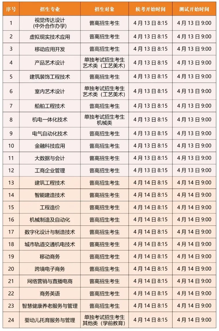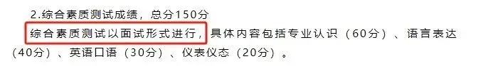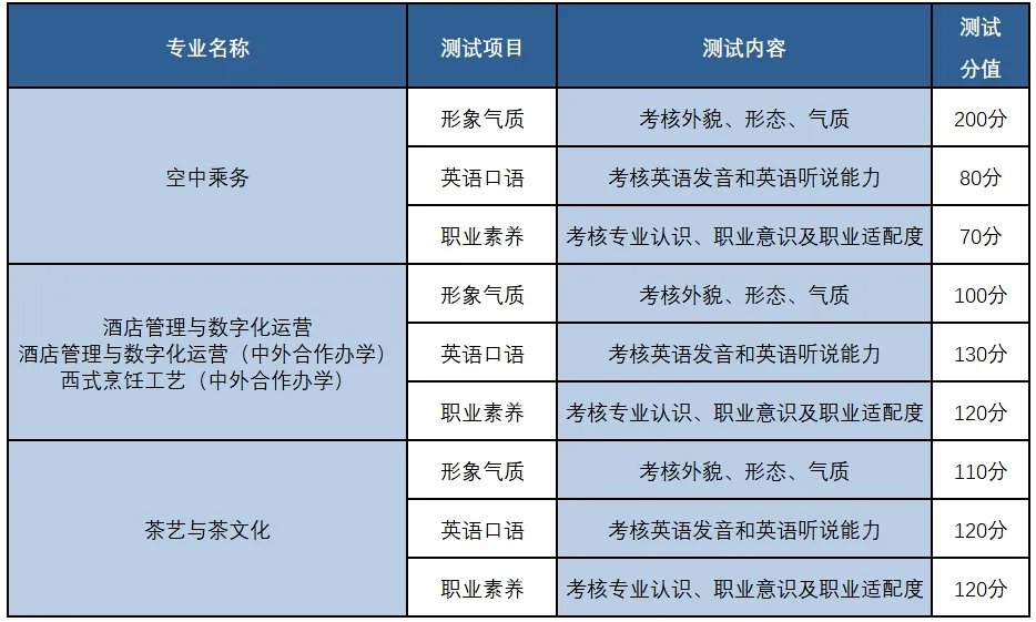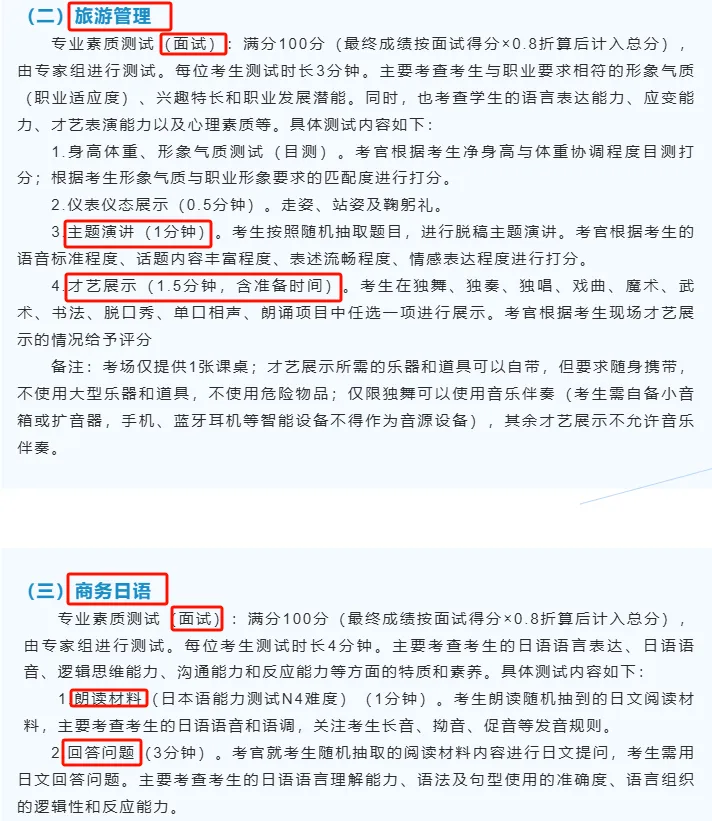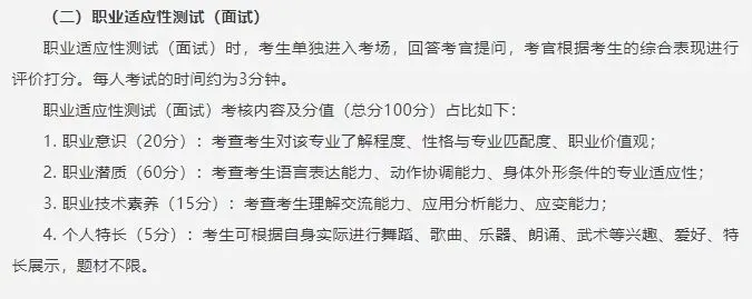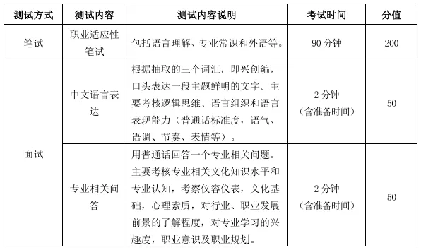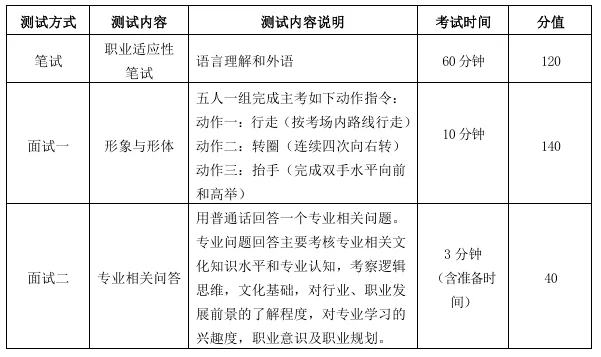 其他专业:分两个考场,一个为英语考场,考核英语发音及英语听说能力;一个为职业素养考场,对形象气质、职业素养等方面具体打分。考生单独进入考场,每人每个考场考试时间约3分钟。考试结束后交回测试号结束考试。