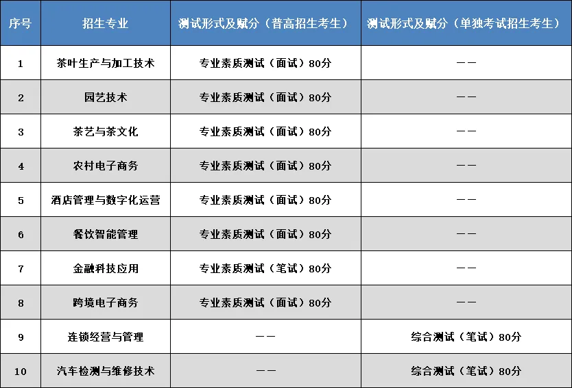 2.面试专业:茶叶生产与加工技术、园艺技术、茶艺与茶文化、农村电子商务 、酒店管理与数字化运营、餐饮智能管理 、跨境电子商务