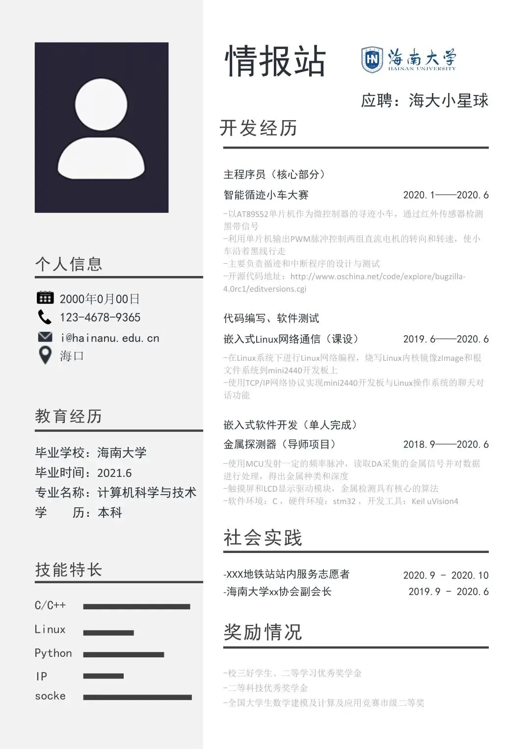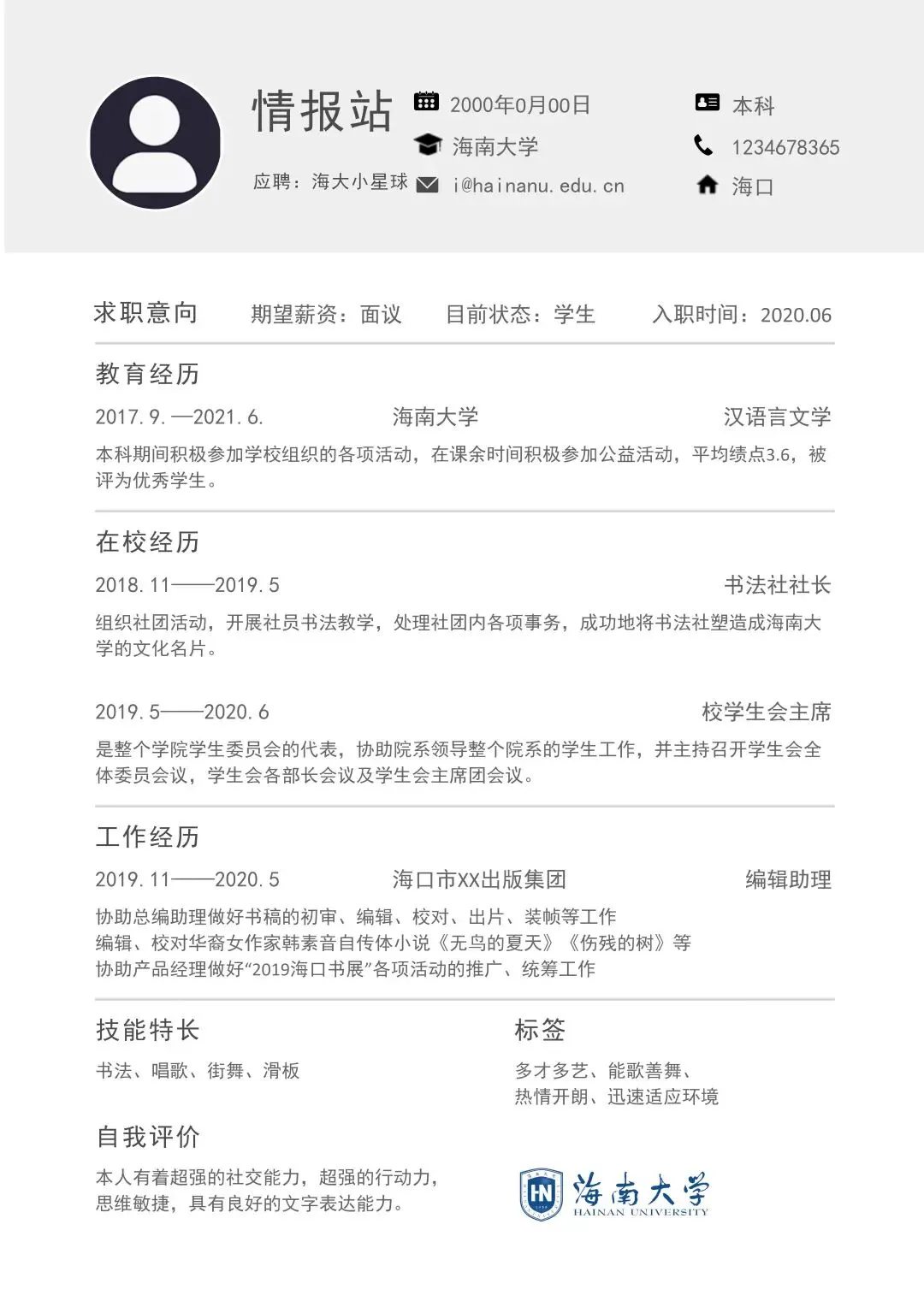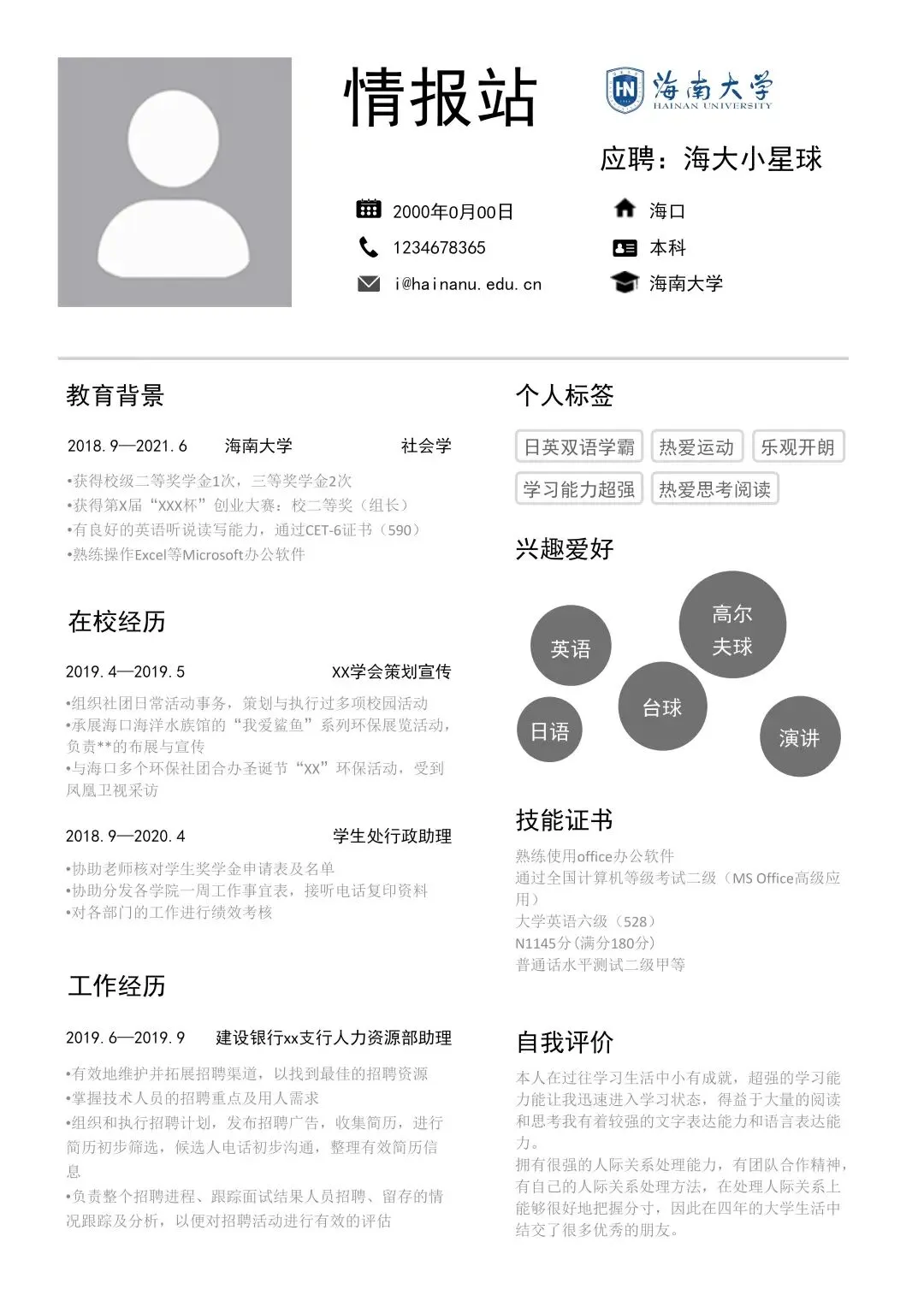 本次为海南大学简历
