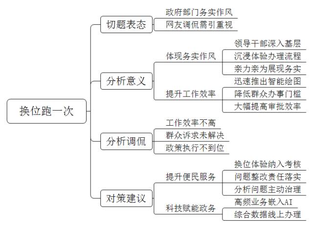 本题属于社会现象类题目,通过审题可知主题是围绕“换位跑一次”行动,考生在分析时不仅要就该行动进行分析,还要结合部分网友调侃的内容展开分析,并就如何真正提高政务服务质量给出对策建议。下面,具体结合题目详细进行分析。