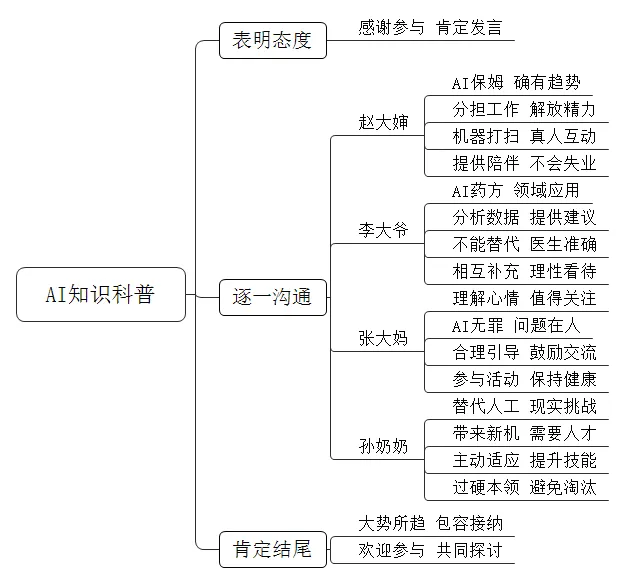 本题采用了逐一回应的方式,来消除了社区居民们对于AI技术的担忧,但考生在作答时,除了采用这一方式,还可以借鉴人际关系类题型的作答方式,按照“表明态度-解决问题-惩前毖后”的思路,将大爷大妈们反映的问题分为:担心失业、容易偏信、陷入沉迷这三种,并通过问题前置的方式,说明自己要通过什么手段来解决这些问题。例如:首先,感谢各位叔叔阿姨发表的看法;其次,通过讲明AI与人工之间的关系,来消除赵大婶和孙奶奶的担忧;通过讲明利害关系,来帮助李大爷清晰认识AI与医生的互补关系;通过提出建议的方式,来引导张大妈帮助孙子摆脱沉迷状态;最后,再根据大家提出的问题,承诺会设立专门热线,随时解答疑问,帮助大家合理利用AI技术。