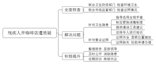 在作答时间允许的情况下,在积极提升环节,还可以补充培训或宣传,来体现对残疾人创新的关心帮助,进一步细化作答内容。具体表述为:“在培训方面,组织开展针对辖区内残疾人创业者的培训和交流活动,内容涵盖卫生管理、经营合规等方面,提升他们的经营水平,也可邀请咖啡店店主分享经验。在宣传方面,通过官方渠道,如公众号、社区公告等,对此次处理结果进行公示,宣传残疾人创业的不易,弘扬其创业精神,消除公众疑虑,将这家店打造成辖区残疾人创业的优秀典范,带动更多残疾人实现就业创业梦想。”