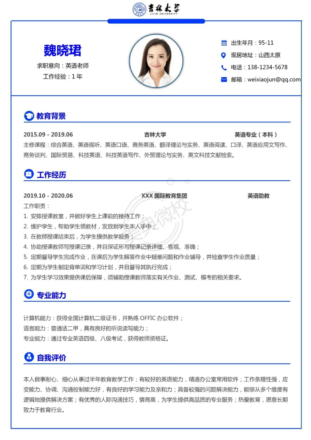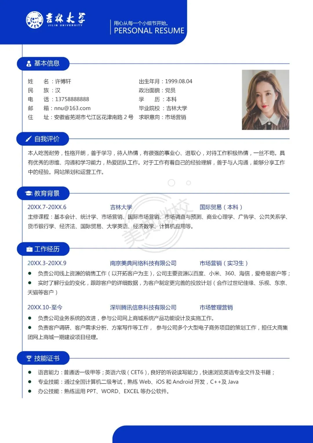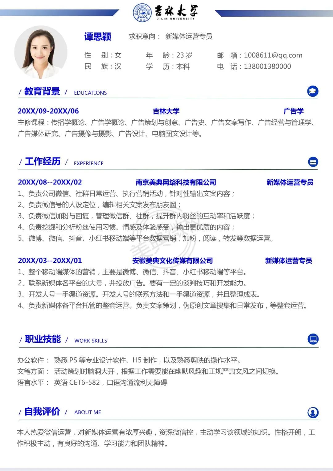 你可以根据自己想应聘的岗位和实际需求,直接进行修改,与岗位匹配。