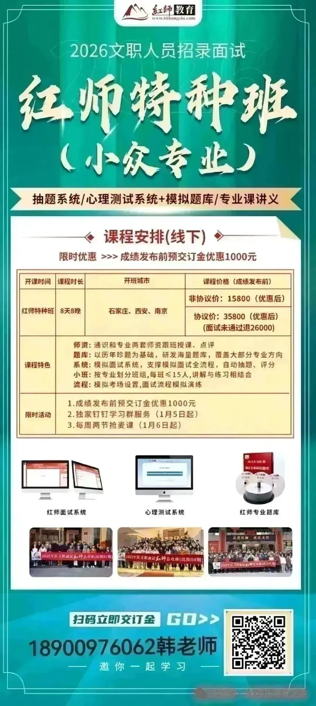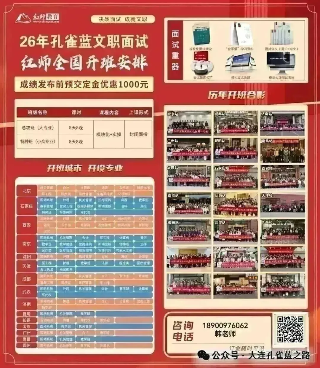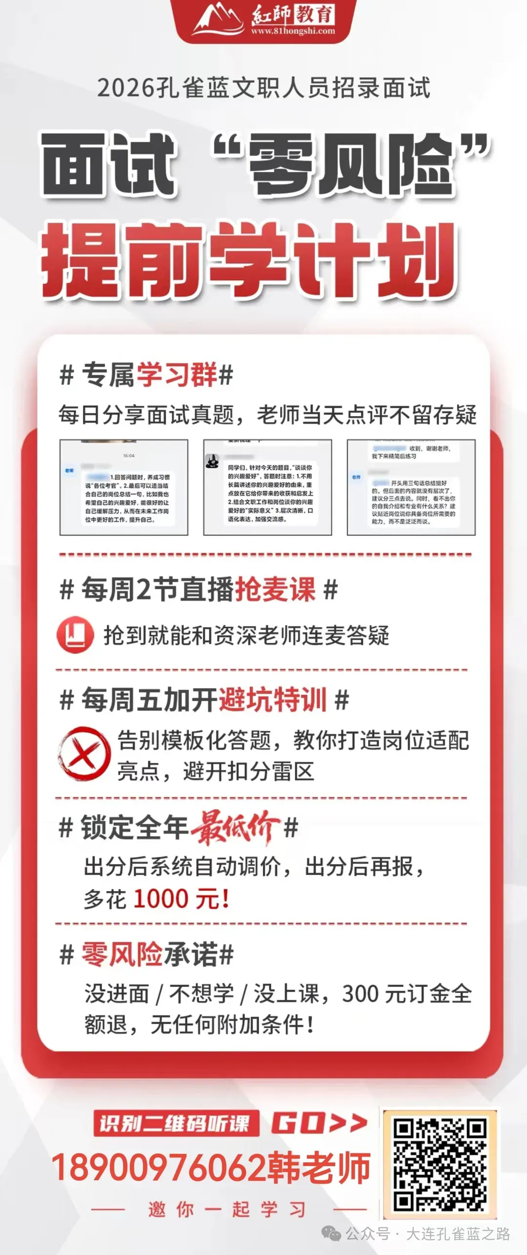 红师教育专注于文职培训8年,承训了大量笔试和面试的学员。备考遇到任何问题可以联系红师教育大连教学中心韩老师。每年所带学员都有上岸,为您1对1免费解答!