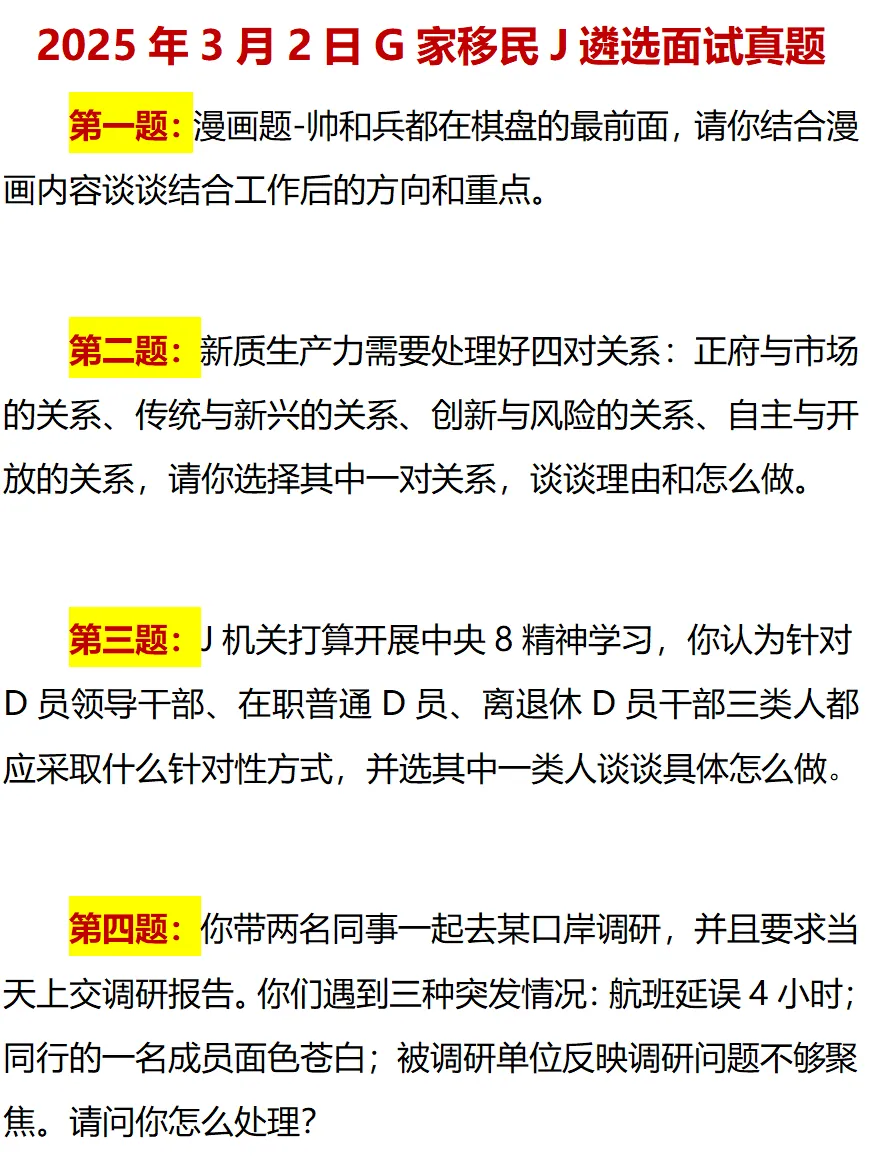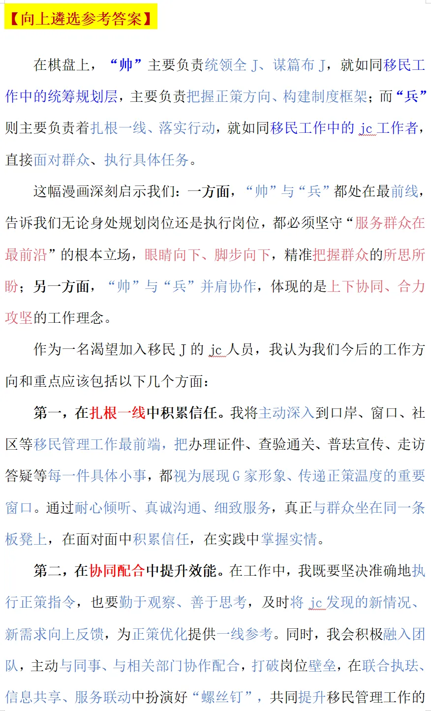 师兄今天重点给大家讲一下第一题漫画题,这是移民局的特色题型,我给大家梳理出作答思路并给一版作答示范!题目:漫画题-帅和兵都在棋盘的最前面,请你结合漫画内容谈谈工作后的方向和重点。【作答思路】