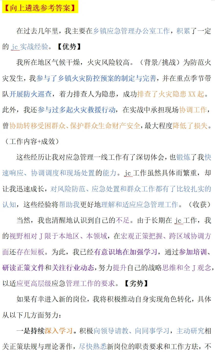 师兄今天重点给大家讲一下第一题,这种题目看似简单,但非常能凸显人岗匹配度,我给大家梳理出作答思路并给一版作答示范!题目:谈谈你的优势和劣势,今后在工作后如何做好岗位转化。【作答思路】
