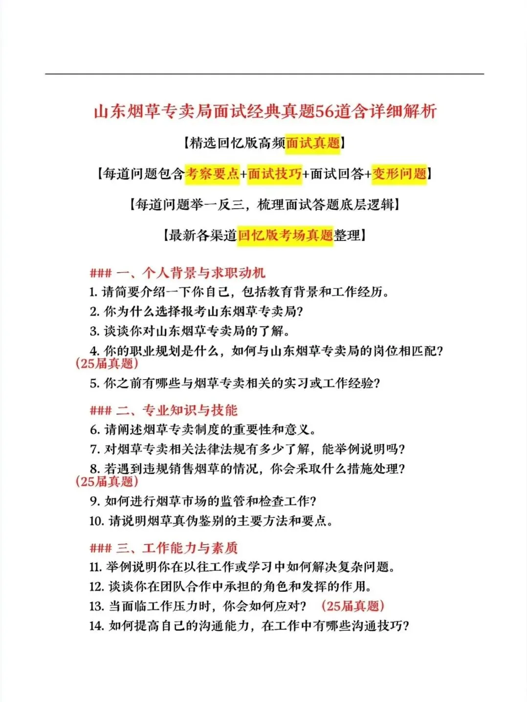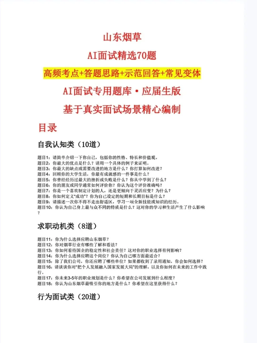 1.28山东烟草面试真题经典题56道+山东烟草AI面试精选70题山东烟草AI面试精选70题电子版PDF资料