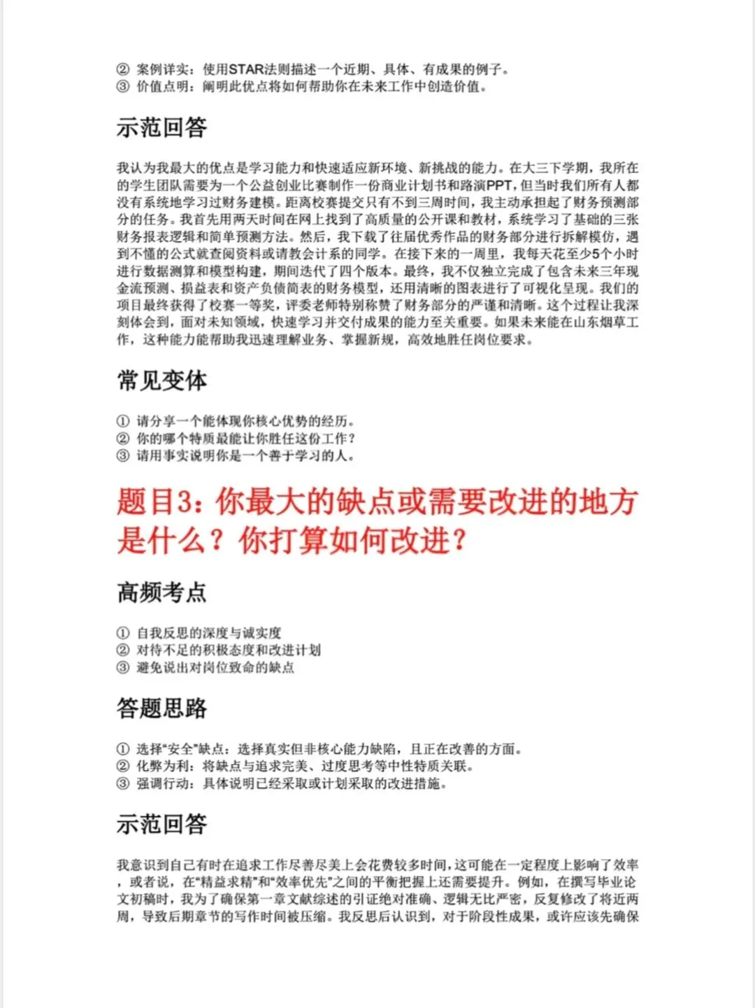 内容很全,题型覆盖自我认知、岗位认知、求职动机、行为面试、情景假设、综合分析等模块,考点分析、答题思路、示范回答、变体题都有,结构清晰,直接拿来背就行,备考效率高~