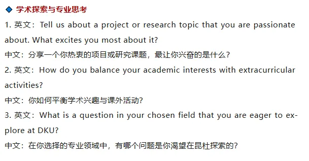 • What academic challenges do you anticipate at DKU, and how will you address them?(你预计在昆杜会遇到哪些学术挑战?如何应对?)