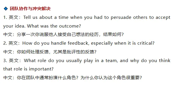 • Tell us about a time when you handled a conflict with a classmate or colleague.(分享一次你如何处理与同学/同事的冲突?)